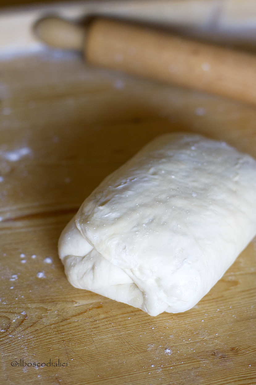 Formare un quadrato e avvolgerlo nella pellicola. Fare riposare il panetto infrigo per 6 ore. Se l’impasto lievita dopo un paio d’ore sgonfiarlo.