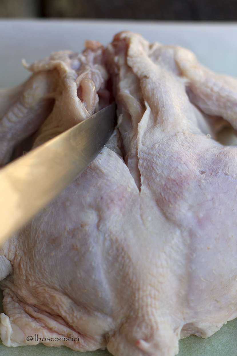 - Adessoruotate nuovamente il pollo e mettetelo con il petto a contatto con iltagliere. Tenetelo schiacciato con una mano ed incidete nel centro dellaspina dorsale scendendo dal collo alla coda. Qui troverete resistenzaall’inizio ma poi proseguendo sarà molto più agile. Aprite quindi il pollo alibro. Via via che procedete nel lavoro, asciugatevi bene le mani cercando diaverle sempre prive di grasso che inevitabilmente potrebbe rilasciare ilvolatile. Il coltello deve essere sempre ben fermo nella vostra mano.